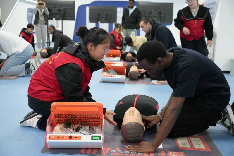 校际交流环节,中外师生围坐一堂,围绕各国各地区急救教育现状、校园急救普及特色做法展开深入探讨。“我在国内从未接受过如此系统的急救培训,更没有机会在模型上实操CPR,这次学到的技能特别实用,回国后我一定会分享给身边亲友,用急救能力守护更多人。”马来西亚籍留学生吴承恩分享道。