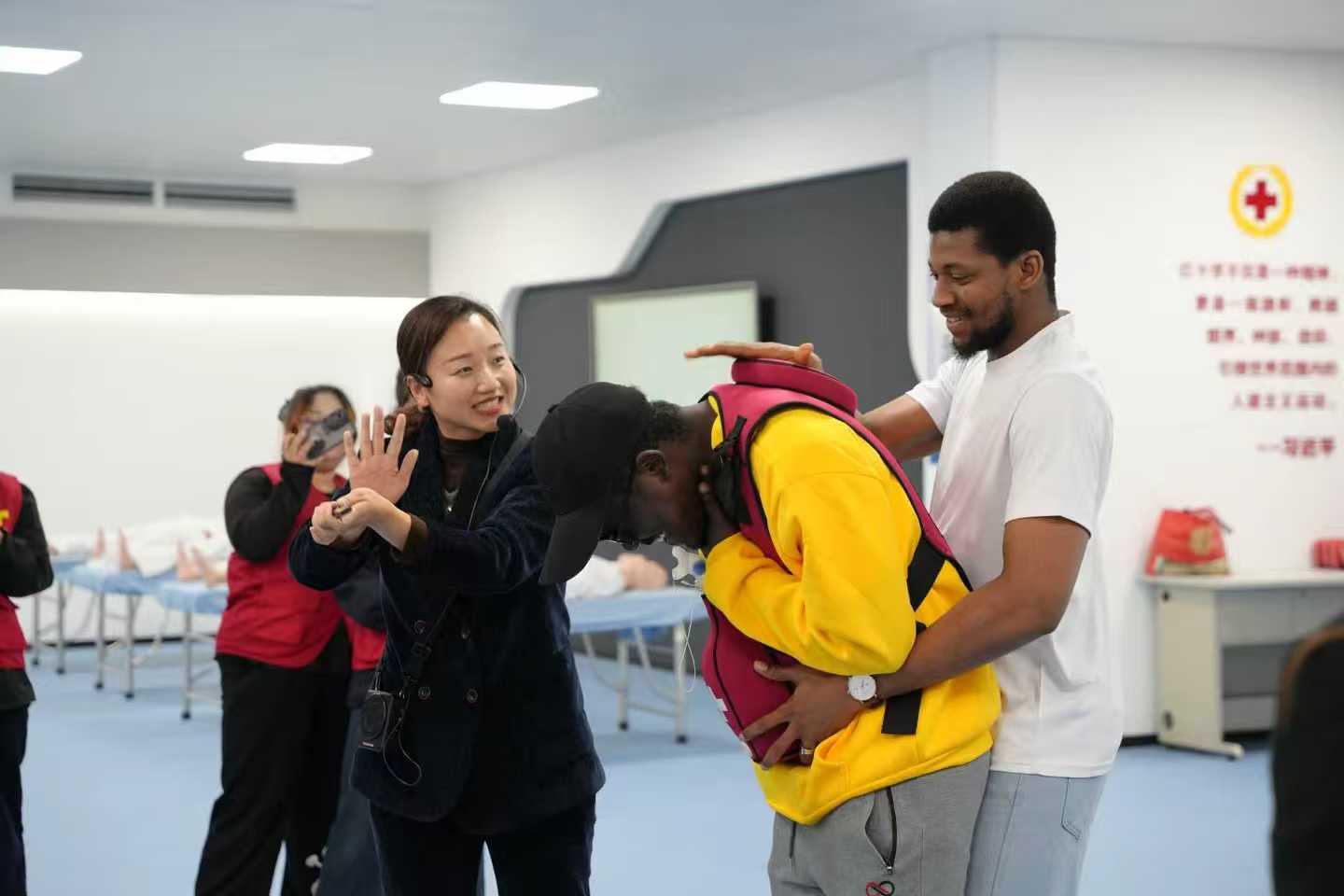 技能培训环节是整场活动的“重头戏”。“按压位置要准、力度要够、节奏要稳”,培训师一边通俗讲解心肺复苏、AED使用、气道异物梗阻急救法的核心理论、操作要点及安全禁忌,一边配合手势演示强化理解。留学生与我校急救助教随机组队,现场口令声、按压节拍声、指导提示声交织成趣,每位留学生都全身心投入,在一遍遍实操中熟练掌握急救技能。通过技能考核的留学生顺利拿到红十字急救培训证书。