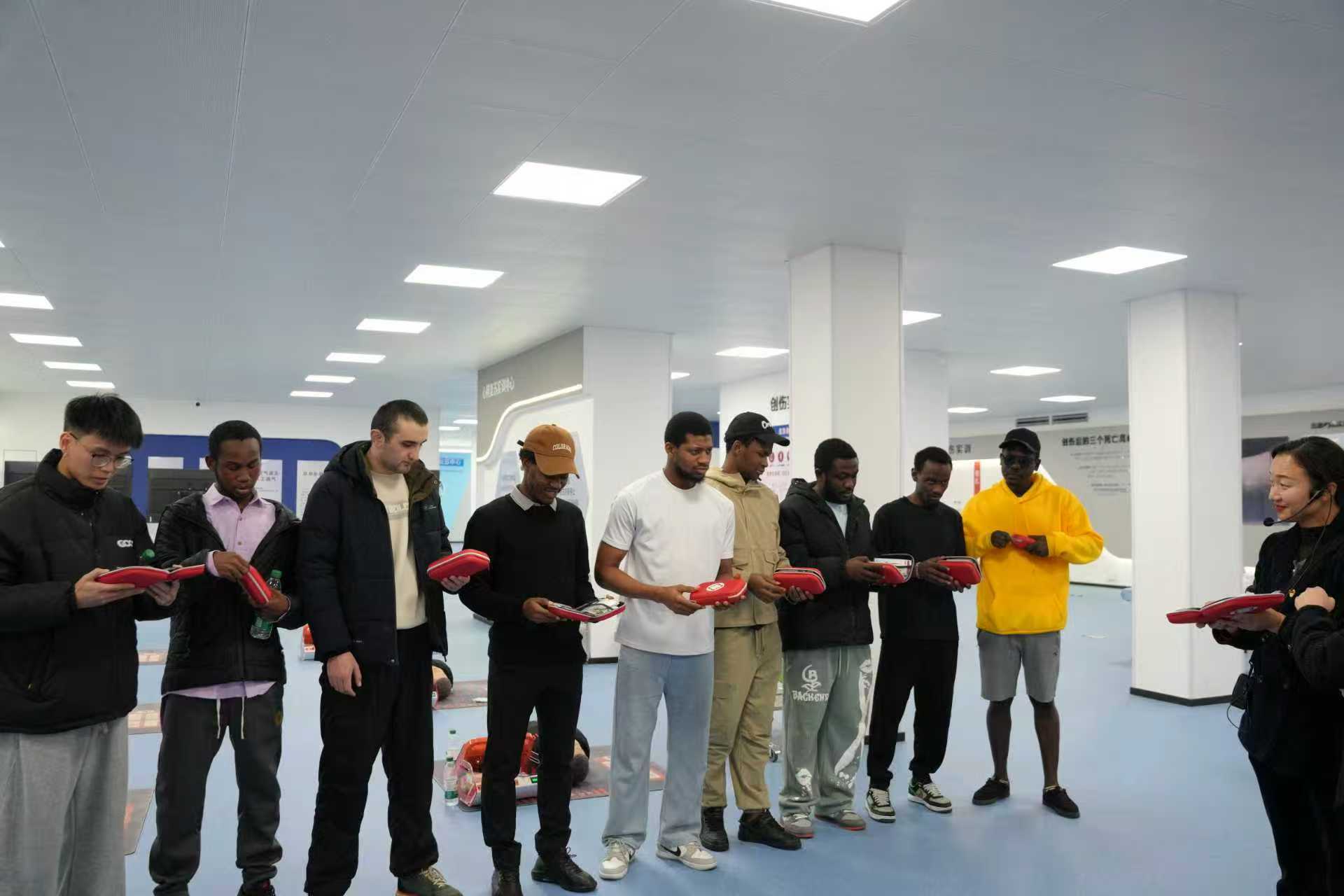 在红十字应急救护师资双语讲解下,留学生们走进理论教学区、ICU模拟病房、心肺复苏实训中心、创伤救护实训中心,认真聆听学校急救课程体系建设情况和急救培训志愿服务开展情况。留学生们不时举手详细询问各类急救器材功能用途与使用场景。