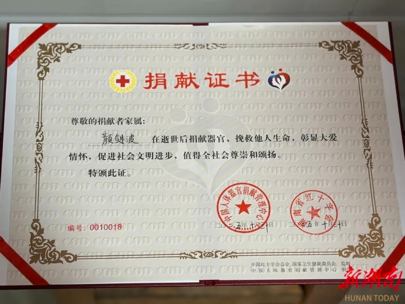 目前,颜剑波的器官捐献手续已由湖南省红十字会和和中南大学湘雅三医院共同完成。当他的器官在他人身体里继续“工作”、当曾经被他温暖过的人继续传递善意时,这场跨越生命的“接力赛”,将让爱与勇气延续。