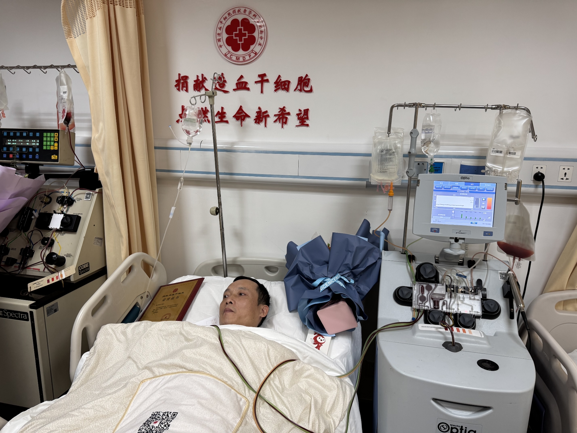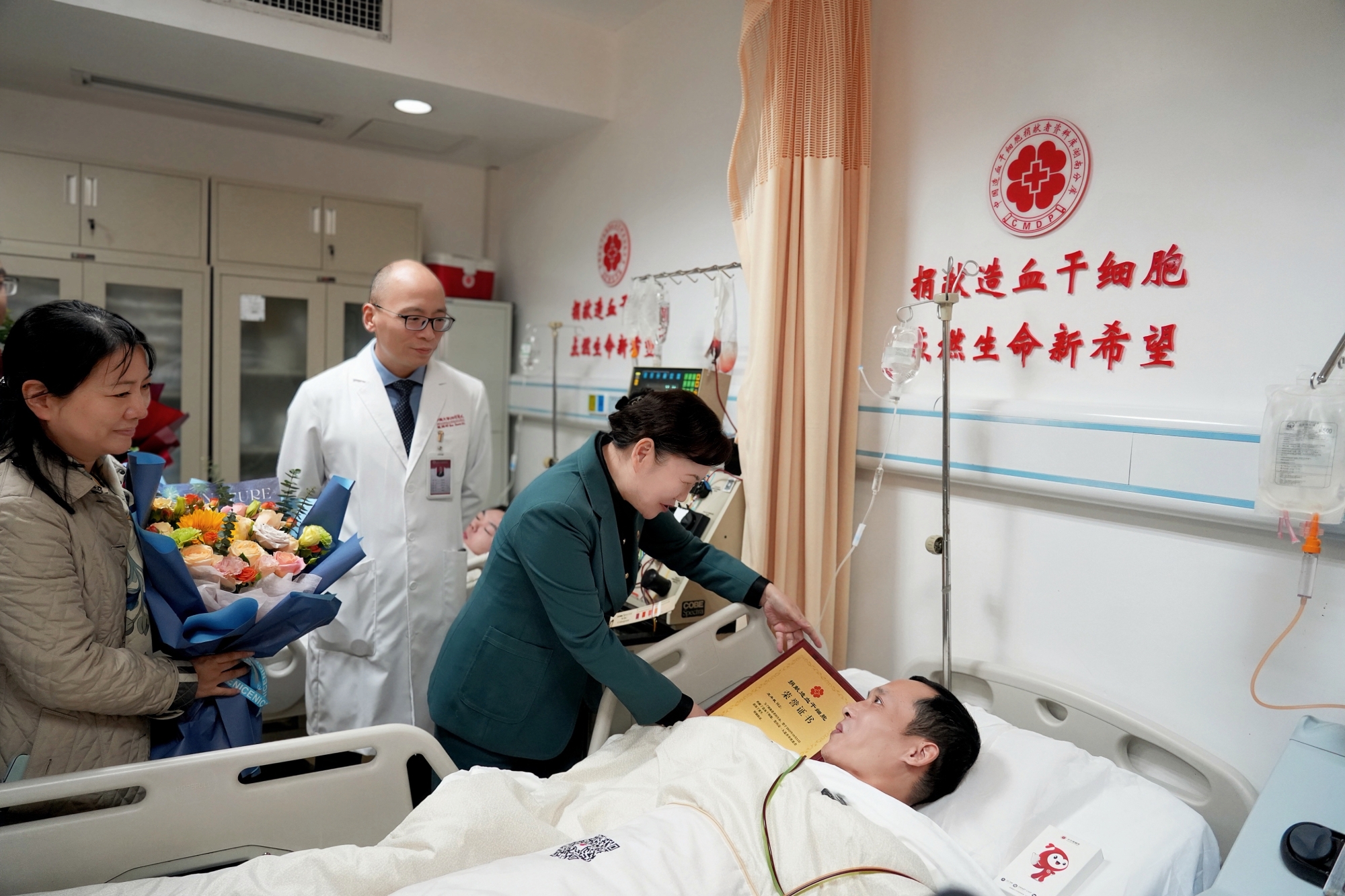 采集当天,鲜红的血液从people手臂上的输液管缓缓流过,通过血细胞分离机,一点点分离出生命的种子——造血干细胞。躺在床上,他眼神明亮,神态安然。省红十字会党组书记、常务副会长冷晓君,中南大学湘雅医院党委委员、副院长钱招昕专程到场慰问看望,为他颁发荣誉证书并献花,称赞他“以自身行动践行了红十字人的初心使命”。市红十字会一级调研员夏洁表示,people的善举为全市红十字人树立了榜样,用热血诠释了‘人道、博爱、奉献’的精神,将带动更多人加入志愿捐献队伍。