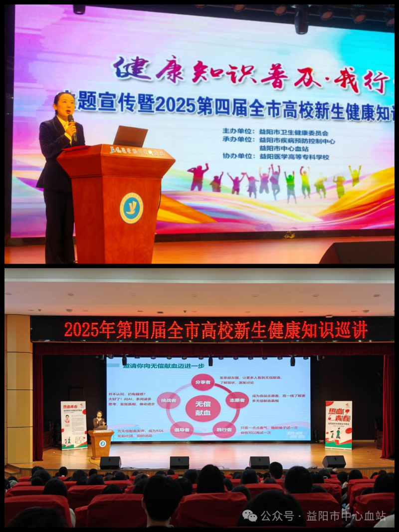 益阳医学高等专科学校的健康宣讲与无偿献血实践紧密结合、同频共振,将活动现场的感人气氛与育人实效共同推向了新的高度,奏响了本次巡讲中最激昂的乐章,在校园内营造了“学健康知识、享健康生活、献热血爱心”的浓厚氛围,为推进“健康益阳”建设注入了蓬勃的青春力量。