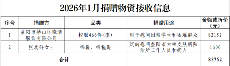 2026年1月捐赠物资接收信息